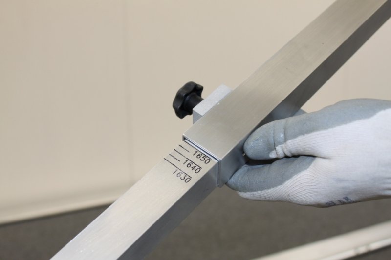 … und an der Lehre eingestellt. Da die Modullänge nicht identisch mit dem Abstand der Bodenschienen ist, erspart die Lehre den Einsatz einer Umrechnungstabelle.