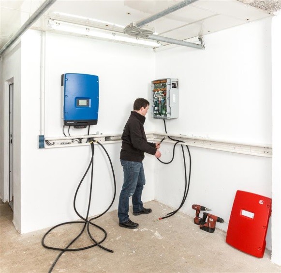 Die Anschlusskabel für die Batterie werden in Position gebracht. Die Länge der Batterieanschlusskabel darf nur nach Rücksprache mit dem Hersteller verändert werden. Die beiden Kabel (+/-) müssen dieselbe Länge haben. Es gelten die relevanten Teile der Normenreihe DIN VDE 0100 „Errichten von Niederspannungsanlagen“ sowie der Normenentwurf E VDE-AR-E 2510-2 „Stationäre elektrische Energiespeichersysteme vorgesehen zum Anschluss an das Niederspannungsnetz“.