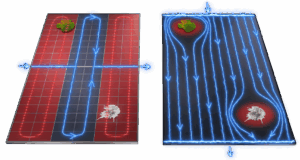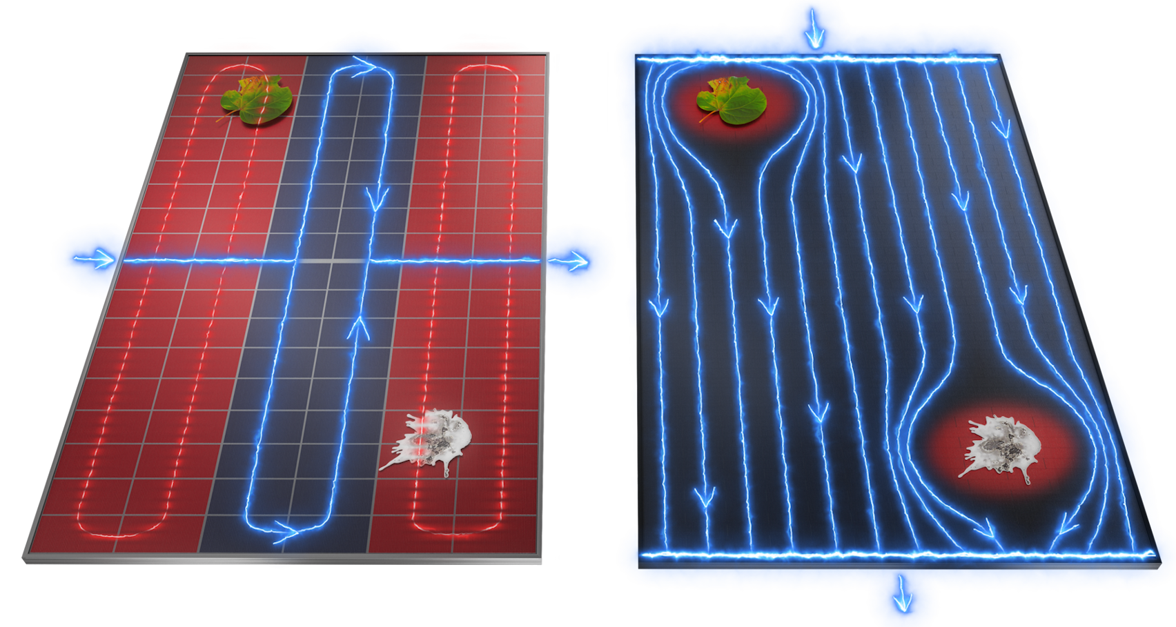 Verschattete Bereiche werden vom Stromfluss gezielt „umgangen“. Während konventionelle Module bei Verschattung ganze Zellstränge blockieren, eröffnet die 2D-Matrix einen intelligenten Umleitungsweg: Der Strom kann sich zweidimensional im Modul bewegen und um die verschatteten Bereiche herumfließen. So steigert die Technologie den Ertrag unter realen Bedingungen spürbar – in Tests sogar um bis zu 70 % bei Teilverschattung.